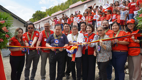 台風オデット被災者への住宅引き渡し式。前列左から4人目がゴードン総裁=26日、比赤十字社フェイスブックページより