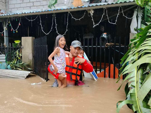 リサール州の被災地で住民を保護するPCG隊員=2日、PCG提供