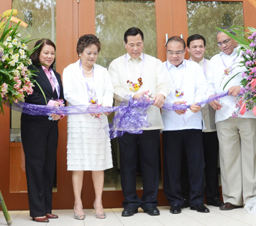 7月上旬、パンパンガ州アンヘレス市の裁判所落成式で、テープカットをする(前列左から)セレノ最高裁長官=当時判事=とデカストロ、カルピオ、デルカスティリョ、ペレス各判事(最高裁提供)
