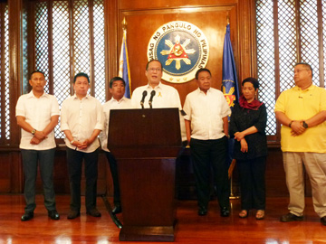 記者会見で、一部協力者の名前を割り出したことを明らかにするアキノ大統領=4日午後5時ごろ、マラカニアン宮殿で写す