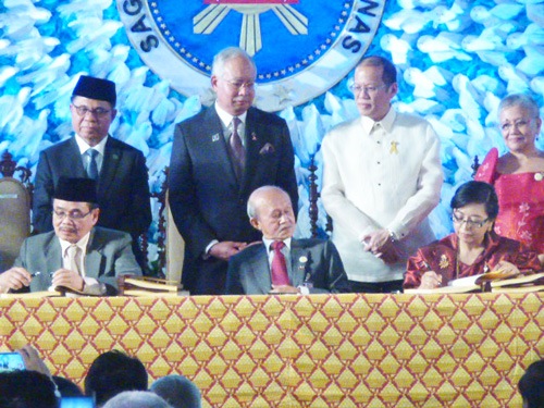 2014年3月27日、包括和平合意文書に調印するフェレール比政府側和平交渉担当(前列右)とイクバルMILF側和平交渉担当(同左)