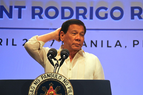 くつろいだ様子で首脳会議後の記者会見に臨むドゥテルテ大統領=29日午後8時半ごろ、首都圏パサイ市の国際会議場(PICC)で冨田すみれ子撮影
