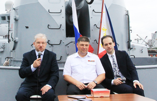 パンテレーエフ艦上で記者会見するコバエフ大使(左)、ミハイロフ海軍少将(中央)=21日午後3時ごろ、首都圏マニラ市の比沿岸警備隊本部で森永亨撮影