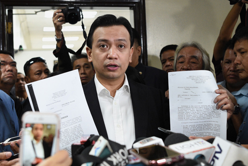 上院で記者会見するトリリャネス上院議員=5日、首都圏パサイ市で撮影(AFP=時事)