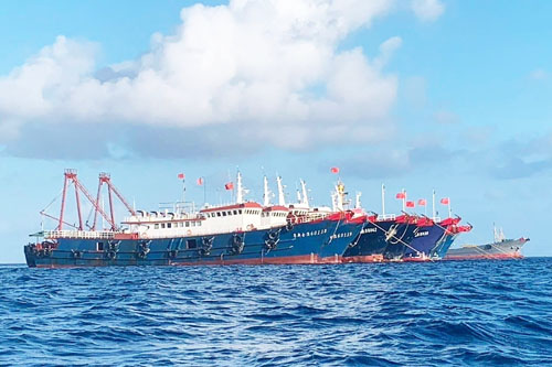 海上民兵が乗るとみられる中国の船=3月31日、南シナ海ウィットサン礁(比大統領府広報室提供、AFP時事)
