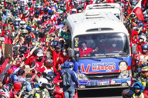 大統領候補ボンボン・マルコス氏(助手席)と副大統領候補サラ・ドゥテルテ氏(後方)の車列に群がる支持者ら。一部からは、不正蓄財や人権侵害で比の歴史に汚...