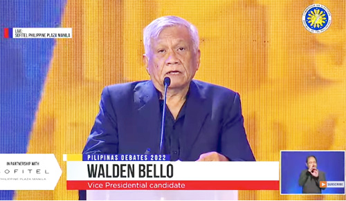 副大統領選に立候補しているワルデン・ベリョ元下院議員(76)は20日、中央選挙管理委員会の第1回副大統領候補による対面討論会の場で、欠席の候補者に罰...