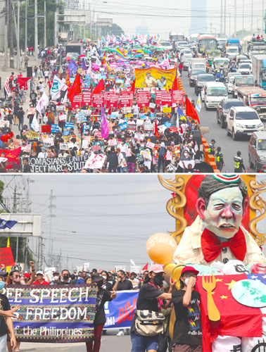 (上)マルコス大統領の初の施政方針演説に合わせて実施されたデモ=25日午前10時過ぎ、首都圏ケソン市のコモンウェルス大通りで岡田薫撮影。(下)マルコス大統領を模した像(右)は最後に燃やされるはずだったが、大雨の中、デモ隊によって粉々にされた=25日午前、首都圏ケソン市で岡田薫撮影