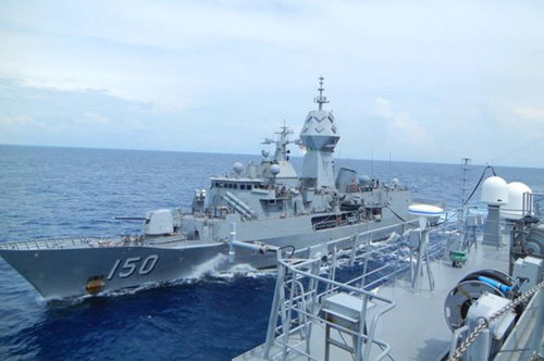 洋上補給訓練中の護衛艦いずも(手前)と豪フリゲート艦アンザック=24日(海上自衛隊公開)