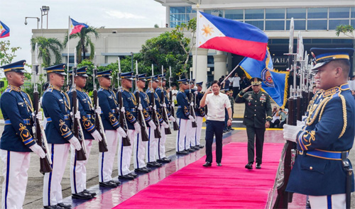 ブラウナー国軍参謀総長に付き添われ出発の飛行機に向かうマルコス大統領=4日、大統領府広報室が公開