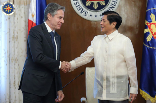 2022年8月に比を訪問し、マルコス大統領(右)と会談したブリンケン米国務長官(左)=大統領府