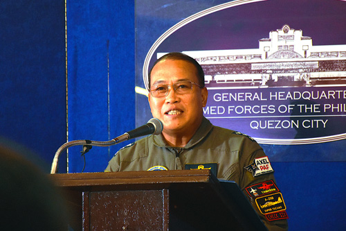 会見を開いたスティーペン・パレニョ空軍総司令官=16日、首都圏パサイ市ビリヤモール空軍基地で竹下友章撮影