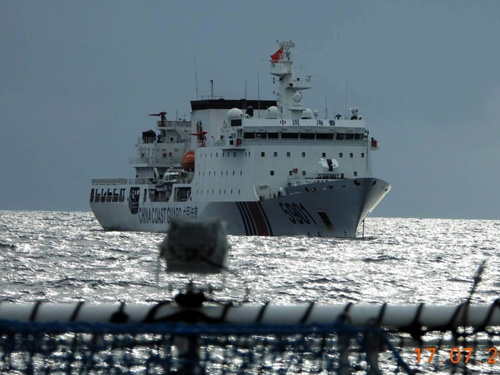 比巡視船に近距離で向かい合う海警局最大級巡視船「海警5901」=17日、エスコダ礁周辺(PCG提供)