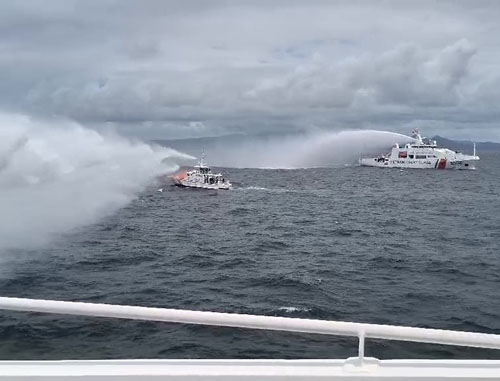 放水砲を使用した消火訓練。奥がベトナム海上警察巡視船=9日、バタアン州沖(PCG提供)