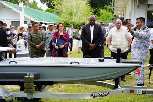 米国が比に供与したT12無人水上機の起動テストを視察した(右から)テオドロ国防相、オースティン米国防相、カールソン米国大使、ブラウナー参謀総長ら=19日、パラワン島(比国防省提供)