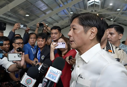 10日、記者団のぶら下がりに会見に応じるマルコス大統領(大統領府)