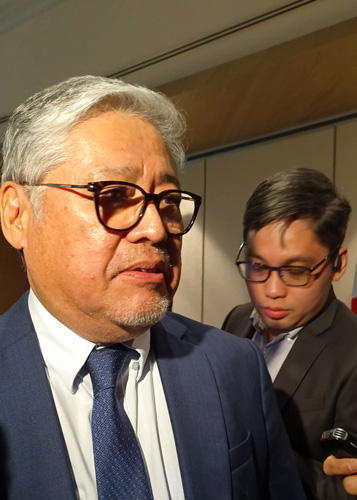 記者団に対応するマナロ外相=15日、首都圏タギッグ市で竹下友章撮影