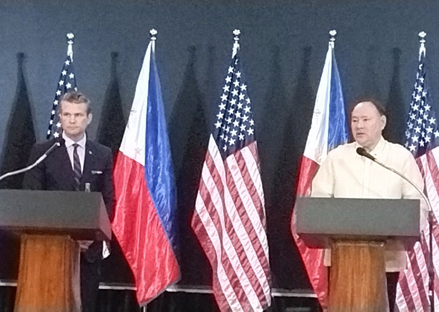 会談後の記者会見に臨むへグセス米国防長官(左)とテオドロ国防相=28日に国防省でロビーナ・アシド撮影