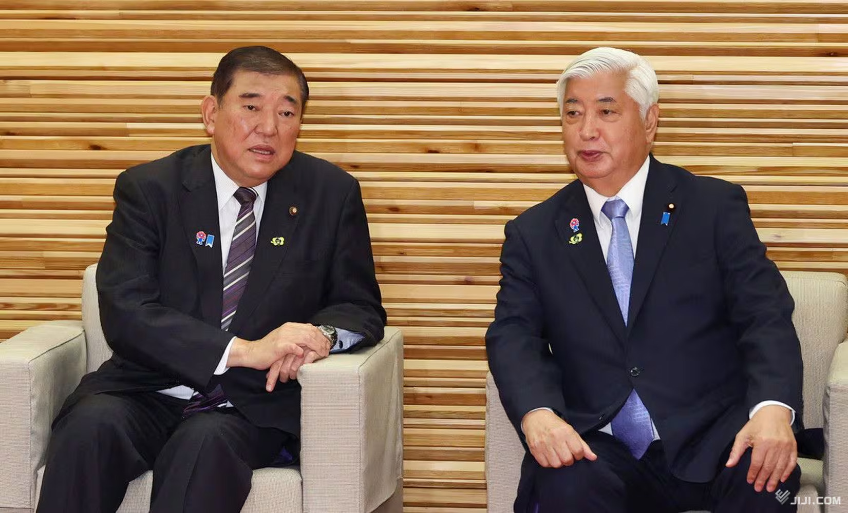 閣議に臨む石破茂首相(左)と中谷元防衛相=25日、首相官邸(時事)