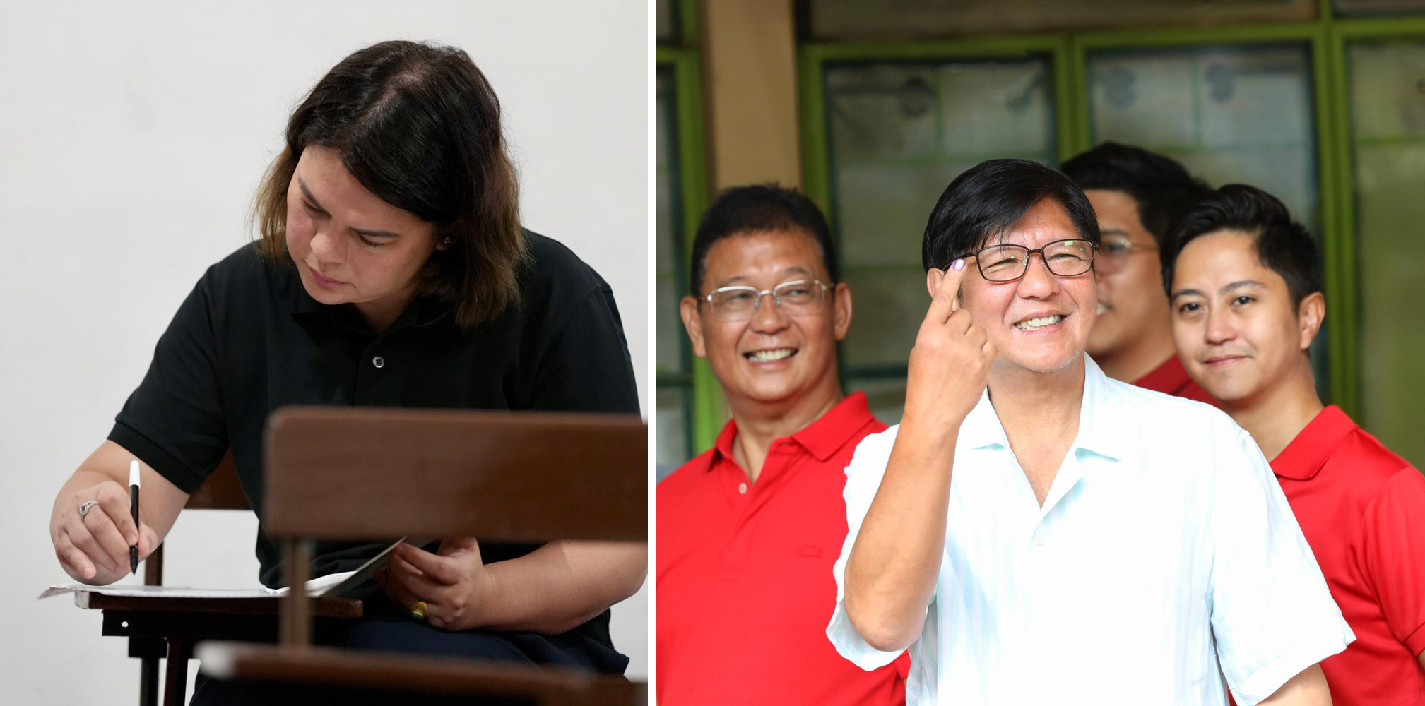 (右)投票を終えたマルコス大統領=12日、北イロコスバタク市(公式フェイスブックで公開)。(下)投票するサラ副大統領=12日、ダバオ市(副大統領室提供)
