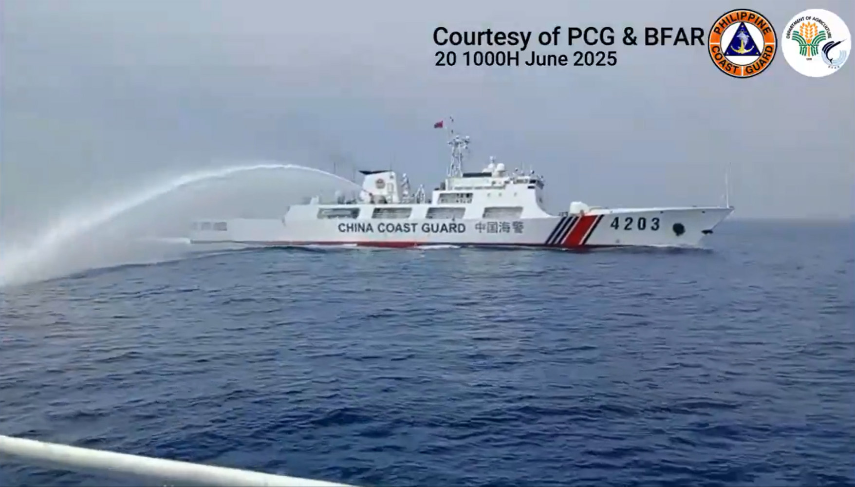 比公船に放水砲を発射する中国海警局の大型巡視船=20日、南シナ海スカボロー礁付近(PCGが公開)