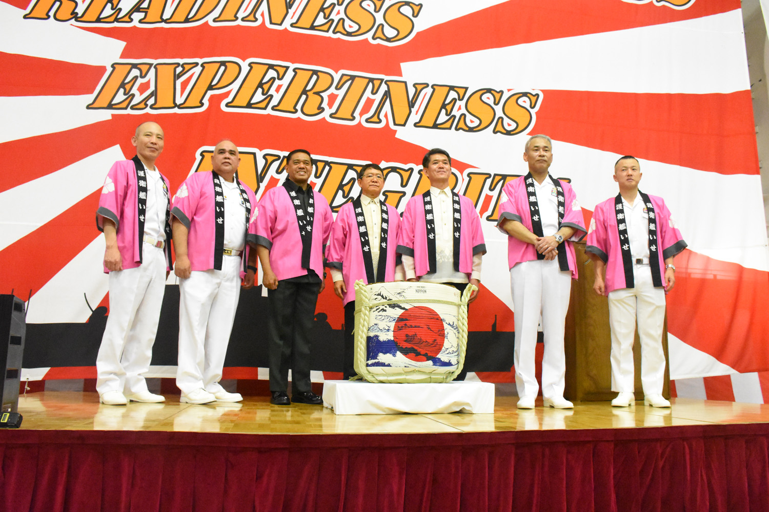 マニラ湾に寄港中の護衛艦「いせ」(197メートル)艦内で23日、自衛隊創設71周年記念式典が開かれた。同式典はこれまで大使公邸で開かれていたが、今年は「ヘリ空母」として知られる同艦で開催。防衛協力の深化を象徴する式典となった。比からはアニョ国家安全保障担当大統領顧問、ブラウナー国軍参謀総長、日本からは遠藤和也駐比日本国大使、海上自衛隊第4護衛隊群司令の夏井隆海将補があいさつし、自衛隊の71年の歩みを祝すとともに、比日部隊間協力円滑化協定(RAA)締結後の比国軍・自衛隊間の協力強化に期待を表明した。式典には、ロレンサナ元国防相(23年旭日重光章受章)や、トレンティーノ上院議員、マルコレタ次期上院議員ら国会議員、各国の外交官・駐在武官も合わせ、約250人(登録数ベース)が出席した。