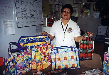 携帯電話入れからアタッシェケース大のものまで多岐にわたるバッグ製品を見せる生協職員
