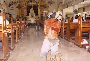 むち打ち苦行のラストシーン。最後にたどり着いた教会内をひざを付いて前進しながら自ら背中をむち打つ=18日午後2時すぎ、パサイ市の「アワ・レイディー・オブ・サロウズ」教会で写す