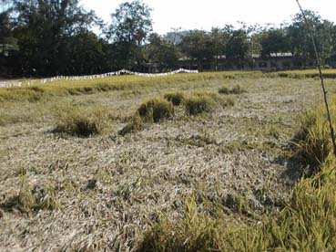 過密栽培でイネが総倒れになった水田