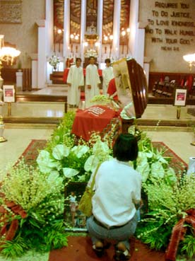 ラメント司教のひつぎに献花する信徒ら=マニラ市パコのIFI本部で9日写す