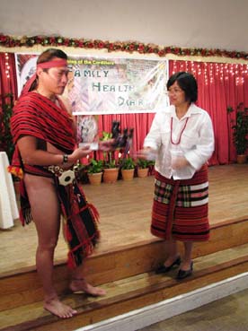 地元版母子手帳の贈呈を受けるイフガオ州のバギラット知事(左)