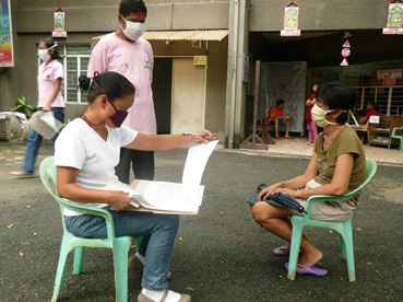 ボランティアから治療の説明を受ける結核患者=首都圏マニラ市トンド地区
