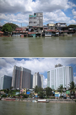 パシッグ市ナピンダン。台風オンドイによる水位上昇が続き、川岸の家屋は川に浮かんでいるようだ(上)。グアダルーペ乗り場の対岸に出現するマンダルーヨン市ボニの高層コンドミニアム群
