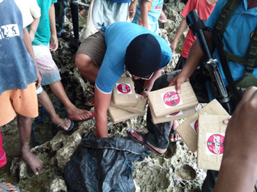 海岸に漂着したコカイン入りのパッケージを回収する漁師たち=大統領府麻薬取締局提供