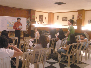 男性受講者と話す「バハサ教室」講師のクリスタントさん(左奥)=10日、在比インドネシア大使館で写す