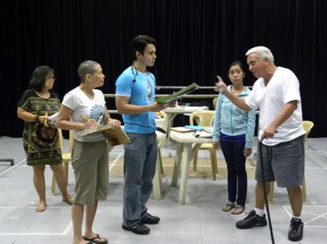 「エバーさんに続け!」の舞台稽古中のフィリピン人出演者たち