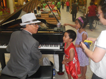 買い物に来た子供と話す話すピアニストのホセ・カルーソ・デキィーニャさん