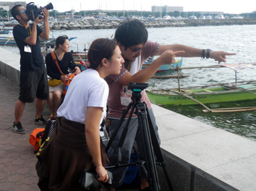 マニラ湾で夕日撮影の準備をする比日学生ら