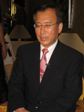 受賞式前に各社のインタビューに答える秋葉市長=8月31日、首都圏パサイ市の比文化センターで写す