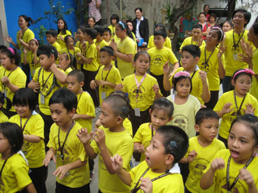 頭部に丸い装置が付いているのが人工内耳を利用している子どもたち=首都圏ケソン市のセント・フランシス・スクールで写す