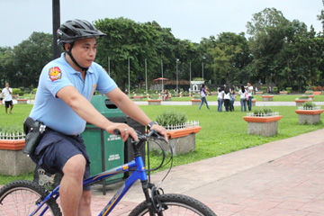 マウンテンバイクに乗ってマニラ市リサール公園を巡回するツーリストポリス