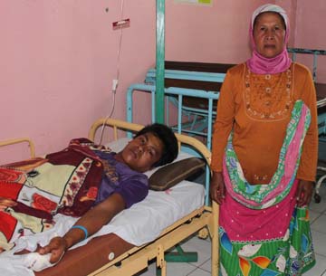 作業中の事故で左手の指3本を切断したオロム・アリと母親=南ラオナ州ワオ町の公立病院で3月12日写す