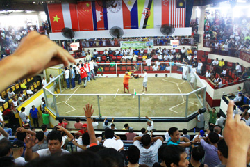 試合前に賭け相手を探す観衆と、鶏の戦う意欲を高めるオーナー(中央)=8日午後2時20分ごろ、首都圏マラボン市の闘鶏場で写す