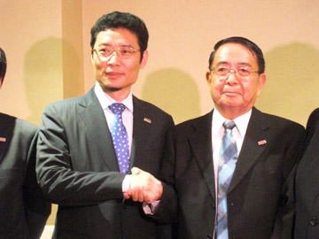 握手するハイアール本社の杜副総裁とハイアール・フィリピンの広田社長(右)=7日午後4時半ごろ、首都圏パサイ市で写す