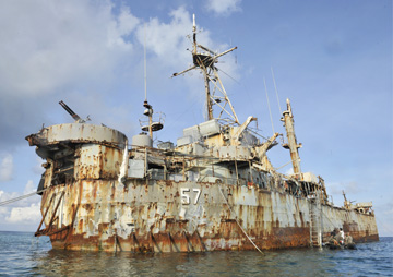 フィリピンによる実効支配の証しとして南シナ海アユンギン礁に放置された座礁船。5月30日写す