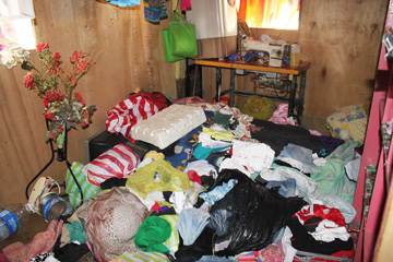 洪水で2階に運び上げられた荷物。床一面に衣類が散乱していた=首都圏マリキナ市で写す