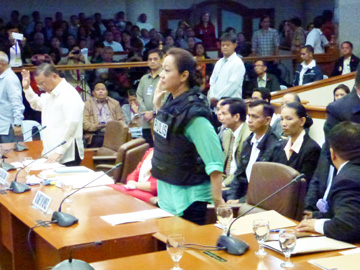 証人喚問の冒頭、防弾チョッキ姿で宣誓するナポレス被告(中央)=7日午前10時20分ごろ、上院本会議場で写す