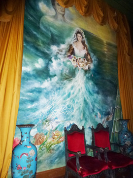 2階の壁一面に描かれたイメルダ夫人の肖像画。子供たちの顔が乗った貝を持つ夫人を、マルコス元大統領が見守る