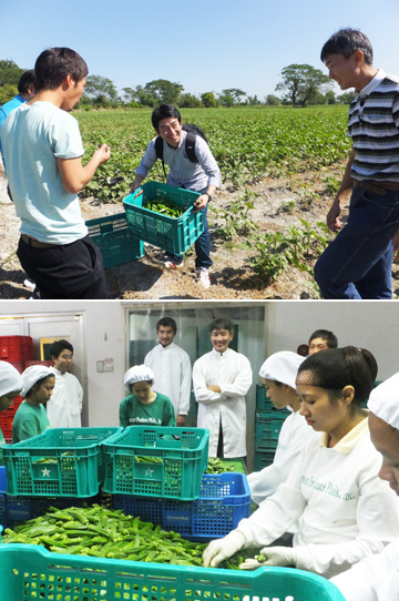 長野県から来比し、農園を視察する荻原昌真さん(写真上中央)。オクラ農園を経営する大渕充さん(写真下奧の中央右)と、農園の工場でオクラを選別するフィリピン人従業員ら