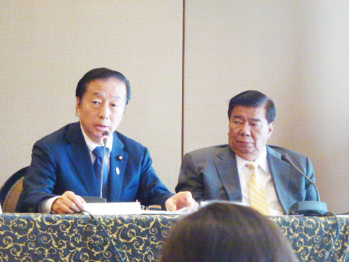 記者会見に臨む比日友好議連の小坂憲次日本側会長(左)と比側のドリロン会長=5日午後1時半ごろ、首都圏マニラ市で写す